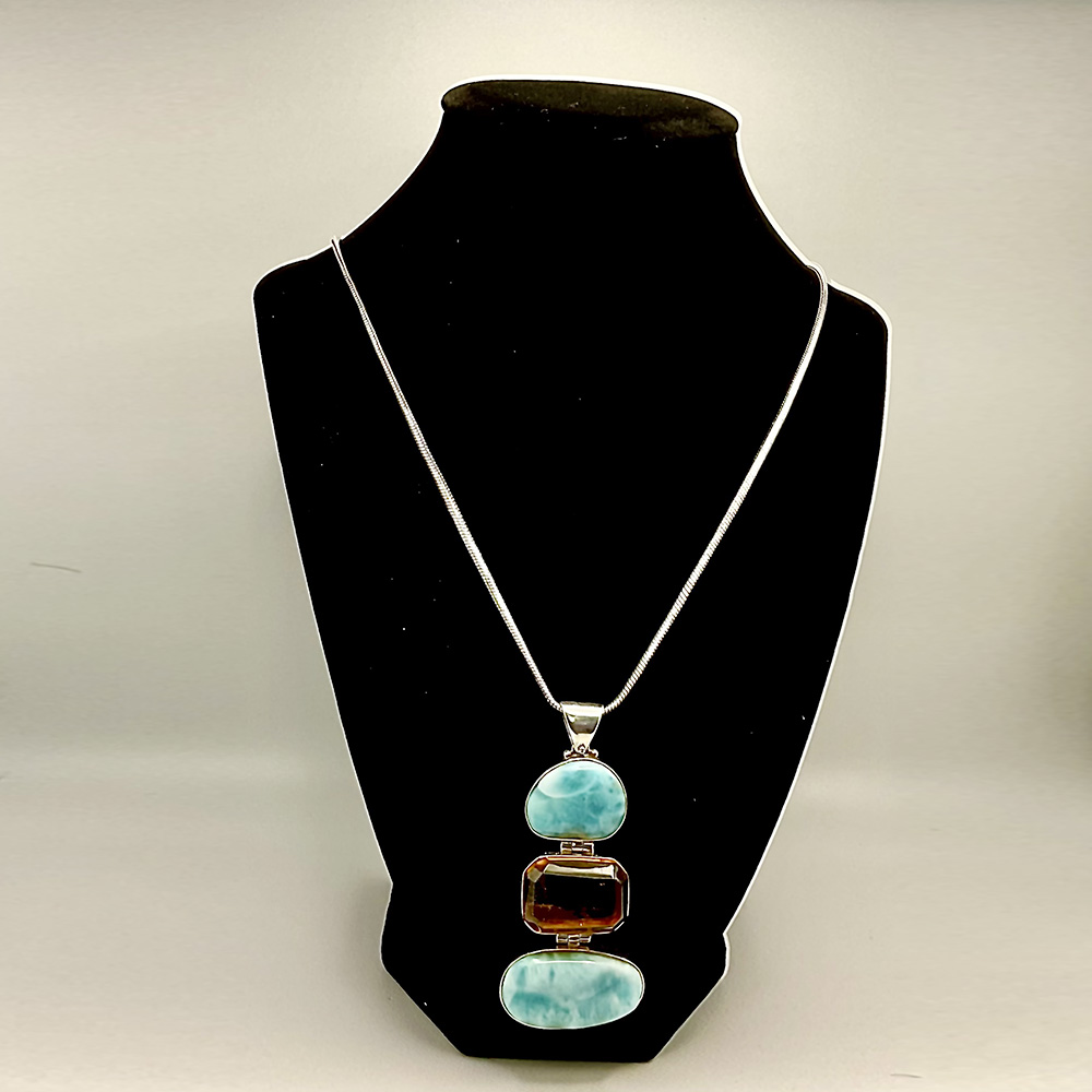 which three luminous stones gently sway: two rare Larimar gems and one radiant amber.