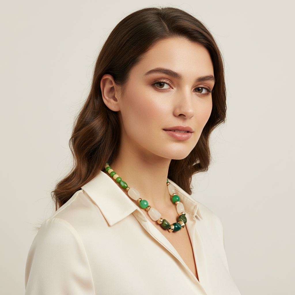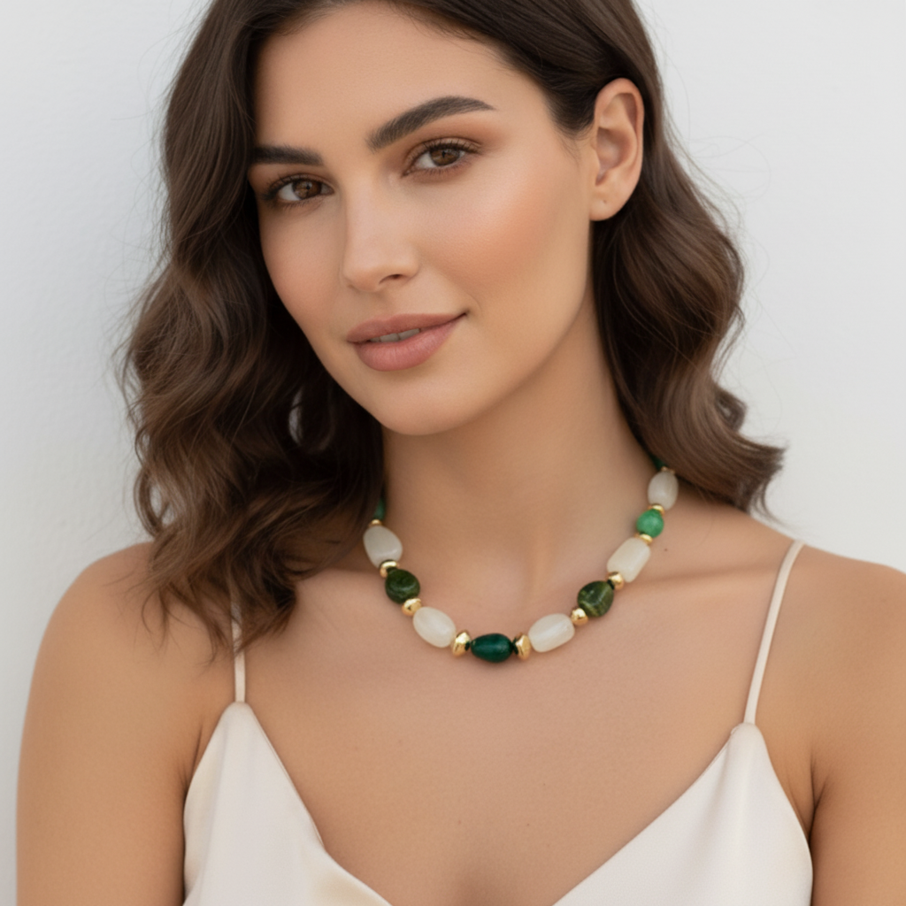 Imagine the golden chain resting gently against her skin, the green and white stones catching the light with every