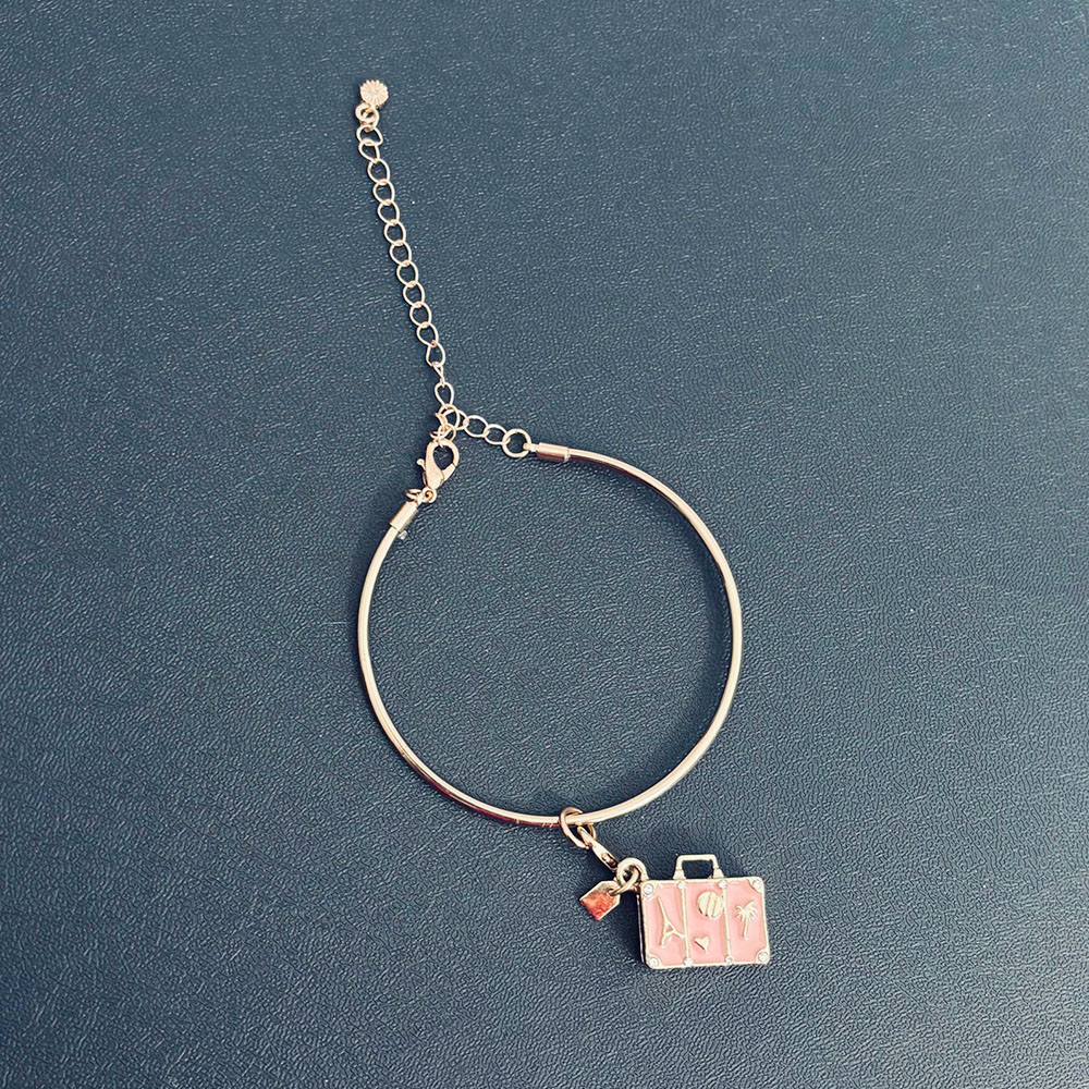 This handcrafted golden bracelet carries a charm unlike any other, a delicate suitcase sculpted from Pink